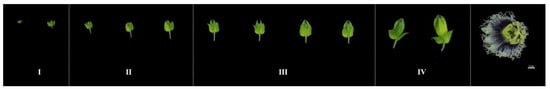 For phenotypic trait quantification in the field lighting supplemental and foliar spray experiment, 10 secondary vine shoots per treatment were randomly selected and labeled for longitudinal monitoring. Baseline measurements (day 0) included lateral branch count, internode number per shoot, total flower buds, and developmental status of flower buds (Figure 1). Tagged plants were re-evaluated 14 d post-treatment to calculate treatment-induced changes: lateral branches (count at 14 d minus baseline), internodes (14 d count minus baseline), flower buds (14 d total minus baseline), and Stage IV flower bud increment (mature buds at 14 d minus baseline). All measurements adhered to standardized protocols for passion fruit phenotyping, with morphological classifications validated against reference specimens.