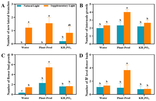 We observed a significant amount of overcast weather in Guangzhou during the months of May and June, which severely impacted the flower bud development process of the passion fruit. We conducted an experiment where we applied six different treatments on the ‘Qinmi No. 9’ passion fruit, which is a highly light-sensitive variety and currently the highest selling on the market. As shown in Figure 2, supplemental lighting (SL) improved development in plants relative to natural light (NL) conditions, including enhanced lateral branch initiation, prolonged internode elongation, elevated total flower bud production, and increased stage IV flower buds. Under NL regimes, foliar treatments with Plant-Prod or KH2PO4 solely augmented floral bud proliferation (Figure 2C). Notably, the synergistic integration of Plant-Prod with SL elicited a marked synergistic interaction, yielding maximal performance across all evaluated morphological and reproductive parameters, surpassing outcomes achieved by SL alone (Figure 2). While KH2PO4 supplementation under illuminated conditions promoted lateral branch formation, no significant improvement in stage IV bud maturation was observed compared to the SL control group (Figure 2B). These findings suggest that SL regulates floral differentiation, while foliar application of Plant-Prod under SL not only enhanced plant growth but also significantly increased flower bud formation and the number of stage IV flower buds.