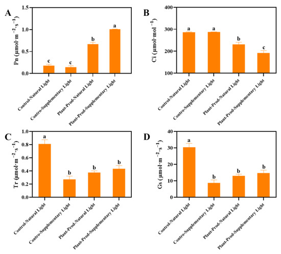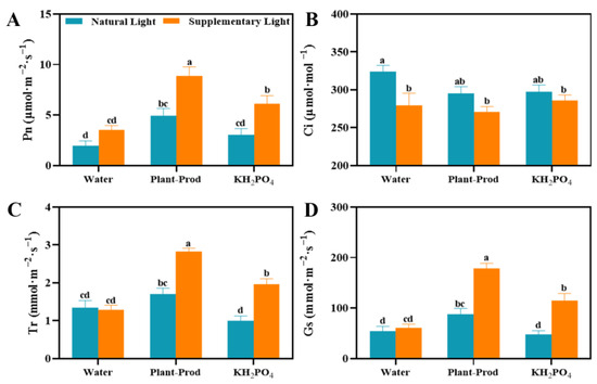 As shown in Figure 6, The PSL elicited the maximal enhancement of Pn, outperforming both isolated SL exposure and untreated controls (Figure 6A). This treatment concurrently minimized Ci (Figure 6B), with PSL reducing both Tr and Gs relative to SL conditions (Figure 6C,D). It is worth noting that only the Pn under SL was lower than the control group, which may be related to the light stress experienced by the passion fruit seedlings.