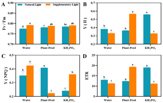 Chlorophyll fluorescence analyses revealed light regime-specific photochemical adaptations (Figure 4). While plants under SL exhibited maximum quantum yield (Fv/Fm) values within the optimal range (0.75–0.8), SL consistently outperformed NL (Figure 4A). Notably, foliar treatments exhibited contrasting light-dependent responses. Plant-Prod reduced actual photochemical quantum yield of photosystem II (Y(II)) under NL enhanced it under SL, whereas KH2PO4 increased Y(II) in NL but suppressed it under SL (Figure 4B). Non-photochemical quenching (Y(NPQ)) inversely tracked Y(II) dynamics across treatments (Figure 4C). Electron transport rates (ETR) mirrored these patterns, with the PSL achieving maximal electron transfer efficiency (Figure 4D). The results showed that under SL, the Plant-Prod treatment exhibited minimal phytotoxicity and the highest electron-transfer efficiency.