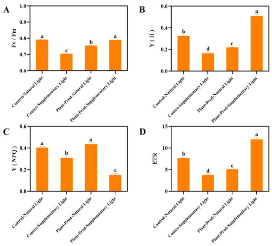 Under SL conditions, the foliar application of Plant-Prod significantly enhanced photosynthetic electron transport rates in mature passion fruit plants without inducing phytotoxicity. To investigate the potential carryover effects of this treatment on early developmental stages, we conducted parallel experiments with passion fruit seedlings. As shown in Figure 7, the Fv/Fm values of the Plant-Prod treatment and the control group were between 0.75 and 0.8 under SL (Figure 7A). The Y(II) and ETR values were highest in the PSL (Figure 7B,D). The Y(NPQ) value was the lowest (Figure 7C). In summary, supplementary light during the seedling stage may be influenced by excessive light influence. In contrast, when the Plant-Prod agent is applied to passion fruit seedlings under SL conditions during the seedling stage, the seedlings are neither affected by the potential phytotoxicity of the agent nor by excessive light.