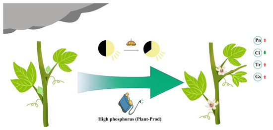 Schematic model of the synergistic effects of supplemental lighting and foliar phosphorus application on passion fruit under low-light stress. Red arrows indicate increases in Pn, Tr, and Gs after treatment, while green arrows indicate a decrease in Ci after treatment.
