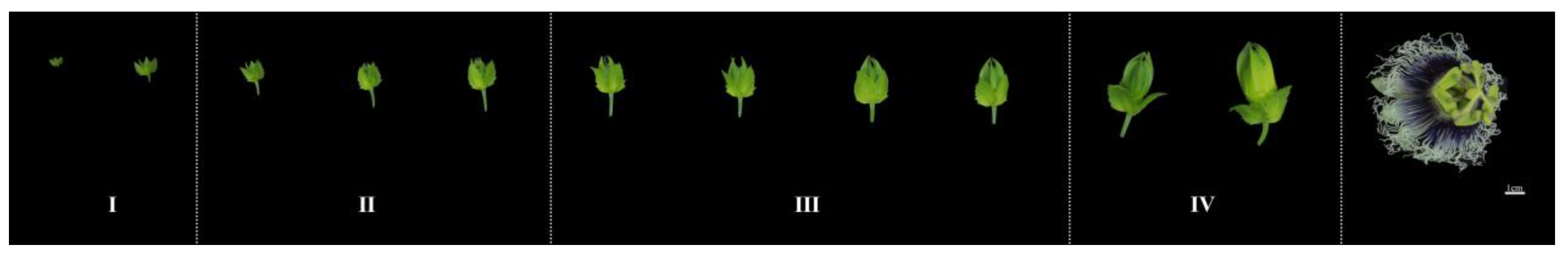 Classification of flower bud developmental stages. Flower buds were categorized into four discrete stages (I, II, III, and IV) based on progressive morphological changes, with stage IV representing fully differentiated buds capable of anthesis (complete flower shown). Bar = 1 cm.