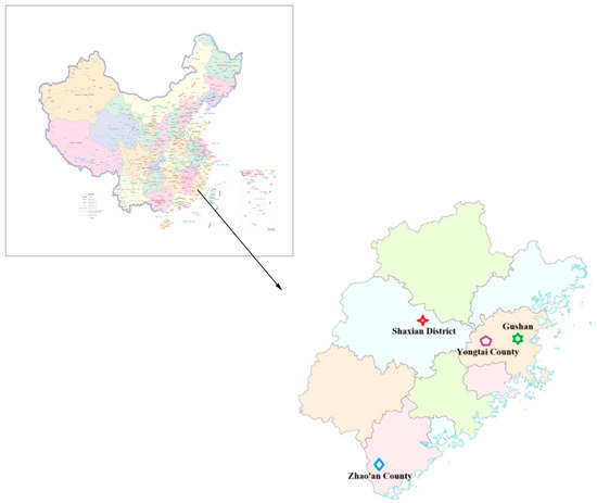 Map of sample collection locations for Cycas species in Fujian, China (CR-FZ-18, CR-FZ-19, and CR-FZ-20 (C. revoluta) from Gushan, Fuzhou, CS-SX-28 (C. szechuanensis) from Shaxian district, CS-YT-09 (C. szechuanensis) from Yongtai County, and CT-ZARG01 (C. taiwaniana) from Zhao’an County).