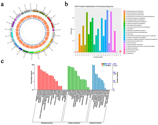 Distribution of various types of mutations on chromosomes and COG annotation of mutated genes. (a) Distribution of various types of variations for each sample on the chromosomes. From outer to inner: chromosome coordinates, gene density distribution, SNP density distribution, InDel density distribution; (b) COG annotation classification for variation genes; (c) GO annotation clustering of variation genes.