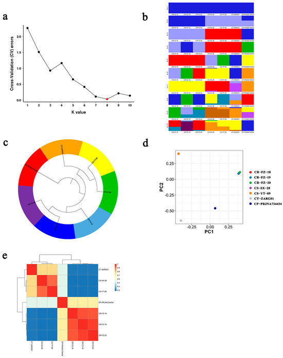 In general, the error rate decreases with increasing values of K, with the optimal K value determined by the lowest cross-validation (CV) error (Figure 3a). At K = 8, the four Cycas varieties, including the reference genome of C. panzhihuaensis, were grouped into six clusters: CR-FZ-18 and CR-FZ-20 (C. revoluta) formed one group (Figure 3b), while CR-FZ-19 (C. revoluta), CS-SX-28 and CS-YT-09 (C. szechuanensis), CT-ZARG01 (C. taiwaniana), and the C. panzhihuaensis reference genome (CP-PRJNA734434) were each assigned to separate groups. Notably, CS-SX-28 and CS-YT-09 exhibited some overlap. The relationship between samples and species indicated that CR-FZ-18 and CR-FZ-20 had very high Q1 probabilities, suggesting they belong to the same species. Conversely, CR-FZ-19, CS-SX-28, CS-YT-09, CT-ZARG01, and CP-PRJNA734434 were identified as distinct groups. Sample CT-ZARG01 showed a Q2 probability of 0.584212 and a relatively high Q6 probability (0.379774), indicating significant mixing between Q2 and Q6. CS-SX-28 had a higher Q5 probability but also exhibited substantial components in Q8 (Table 2).