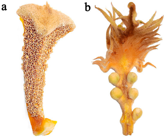Photographs of microsporophyll and megasporophyll of C. revoluta. (a) Represents male microsporophyll, (b) represents female megasporophyll with seeds.