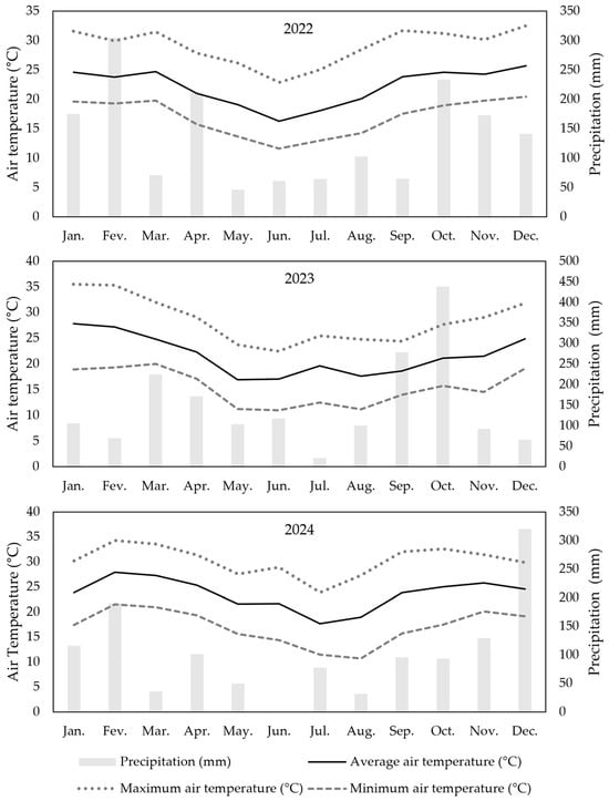 Maximum, average and minimum air temperatures, and monthly rainfall, for Palotina, PR, in 2022, 2023 and 2024 [].