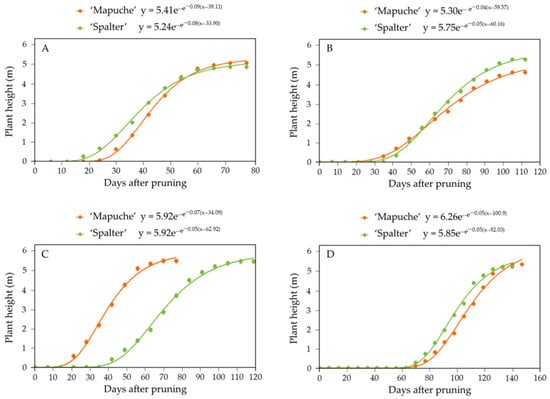Plant growth development (m) of ‘Mapuche’ and ‘Spalter’ hops during the (A) summer 2022–2023, (B) fall 2023, (C) summer 2023–2024 and (D) fall 2024 seasons when grown in a subtropical climate. Nonlinear regression Gompertz model.