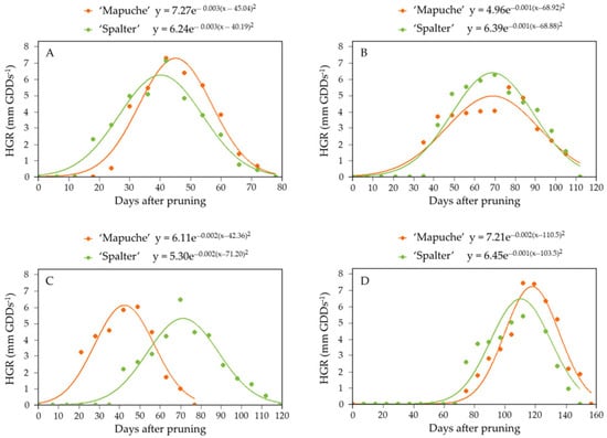 Plant growth rates (HGRs—mm GDDs−1) of ‘Mapuche’ and ‘Spalter’ hops during the (A) summer 2022–2023, (B) fall 2023, (C) summer 2023–2024 and (D) fall 2024 seasons when grown in a subtropical climate. Nonlinear regression Gaussian model.