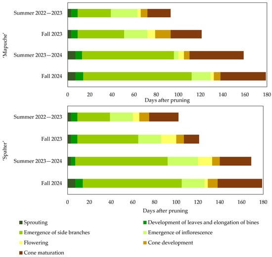 Duration in days of the main phenological stages of ‘Mapuche’ and ‘Spalter’ hop plants during the summer 2022–2023, fall 2023, summer 2023–2024 and fall 2024 seasons when grown in a subtropical climate.