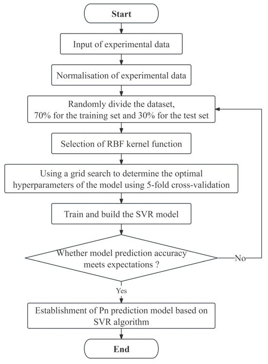 In this study, the RBF kernel function was used for SVR modeling. The hyperparameters (c and γ) were traversed through a grid search over a predetermined range (c: [1–50], g: [1–20], step size 1) and the optimal combination was determined by 5-fold cross-validation to minimize the root mean square error of the training samples. The flowchart for constructing the SVR model in this study is shown in Figure 1, in which the specific steps for modeling the SVR algorithm are as follows: