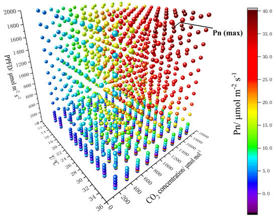 The three-dimensional scatter plots illustrating the effects of environmental conditions (PPFD, CO2 concentration, and temperature) on Pn were generated using Origin 2024 (OriginLab Corporation, Northampton, MA, USA).