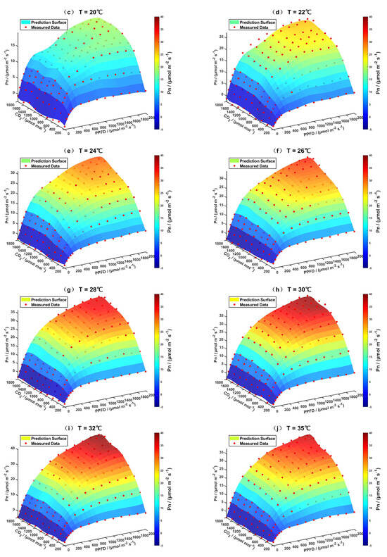 The optimal hyperparameter combination for the SVR model (c = 38, γ = 8) was determined by grid search and 5-fold cross-validation. Model predictions showed high agreement with measured values across the experimental range (temperature: 12–35 °C, CO2 concentration: 200–1800 μmol mol−1, PPFD: 0–2000 μmol m−2 s−1), demonstrating excellent predictive ability (Figure 3). This visual comparison between predicted surfaces and experimental measurements confirms the model’s accuracy in simulating photosynthetic responses to environmental variables.