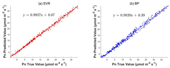 After the models were constructed, their generalization capabilities were evaluated on the test set. The models were used to calculate the Pn values for the test set, which were then compared with the measured Pn values. To visualize the comparison results, the predicted values were plotted against the measured values (Figure 4). The fitted slope of the predicted photosynthetic rate of the SVR model was 0.9927, the closest to 1, and the intercept was 0.07, the closest to 0. These results confirm that the Pn prediction model established using the SVR algorithm performs the best.