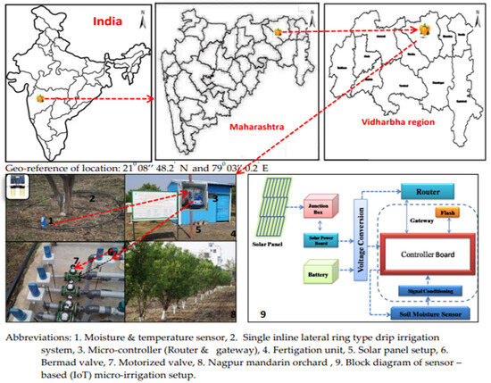 In conventional water management, the crop evapotranspiration-based computation of ETr and Kc is highly technical and labor-intensive, with inconsistent outcomes [15,16,17]. However, increasing automation in micro-irrigation systems along with better delivery mechanisms for nutrients have started making serious inroads toward addressing these issues [18,19,20]. Also, in commercial citriculture, there is a big question mark over the effectiveness of manually operated drip irrigation in the long run, paving the way for automatic-controller-based micro-irrigation for citrus crops over the world [21].