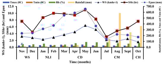 Weather parameters during the experiment in the 2021–2023 period at various phenological stages of Nagpur mandarin. Abbreviations: WS—wind speed; SShr—sunshine hours; Epan—pan evaporation; Rh—relative humidity; Tmax—maximum temperature; Tmin—minimum temperature; WS—water stress; NLI—new-leaf initiation; CD—crop development; CM—crop maturity; CH—crop harvesting.