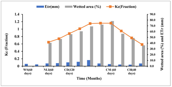 Wetted area (%), Kc (fraction), and ETr (mm) across the crop phenological growth stages during the harvesting seasons of 2021–2023. Abbreviations: WS—water stress; NLI—new-leaf initiation; CD—crop development; CM—crop maturity; CH—crop harvesting.