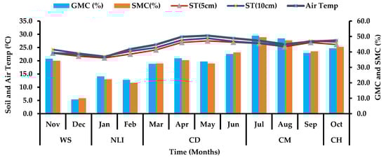 The comparison of soil moisture content (SMC), measured by capacitive-type soil moisture sensors, and the gravimetric moisture content (GMC) across different phenological stages (Figure 4) showed a contrasting difference. During the WS period in the months of November–December, GMC values were significantly higher (35.25%) than those of SM (10.00%), indicating the under-estimation of soil moisture through the sensors under dry soil conditions. As the soil moisture recovered during the NLI stage (January–February), the GMC was observed to be only marginally higher (22.25%) than the SMC (20.00%), suggesting the better utility of SMC under optimum soil moisture conditions. With further advancement in the plant growth stage to CD (March–May), the gap between the GMC (34.65%) and the SMC (32.50%) narrowed, reaffirming the utility of the SMC over the GMC. During the CM stage in the monsoon months (June–August), the GMC and SMC showed the highest agreement, with both methods capturing peak moisture levels (45.49%) in July [49,50,51]. Hence, GMC proved to be more useful than GMC under moist soil conditions and vice-versa under dry soil moisture conditions.