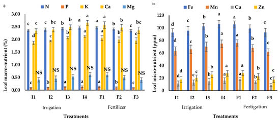 (a,b). Effect of sensor-based irrigation and fertilization treatments on leaf macronutrient (N, P, K, Ca, and Mg) and micronutrient (Fe, Mn, Cu, and Zn) concentrations (based on the means of two harvesting seasons). Abbreviations: nitrogen (N), phosphorus (P), potassium (K), calcium (Ca), magnesium (Mg), iron (Fe), manganese (Mn), copper (Cu), and zinc (Zn). Different alphabets show the level of significance between treatments (a, b, c, and d means treatment with a alphabet is most significant followed b, c, and d in decreasing order of significance).