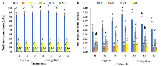 (a,b) Effect of sensor-based irrigation and fertilization treatments on the macronutrient (N, P, K, Ca, Na, and Mg) and micronutrient (Fe, Mn, Cu, and Zn) composition of fruits (based on the means of two harvesting seasons). Abbreviations: nitrogen (N), phosphorus (P), potassium (K), calcium (Ca), sodium (Na), magnesium (Mg), iron (Fe), manganese (Mn), copper (Cu), and zinc (Zn). Different alphabets show the level of significance between treatments (a, b, c, and d means treatment with a alphabet is most significant followed b, c, and d in decreasing order of significance).