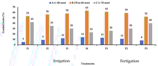 The distribution of fruit size demonstrates the market value of the yield response. The irrigation and fertigation treatments in our study showed a pronounced effect on the size distribution of Nagpur mandarin fruits. Amongst the irrigation treatments, the I4 treatment registered 9% more A-grade fruits, 10% more B-grade fruits, and 19% fewer C-grade fruits over I1 as the conventional irrigation practice. Likewise, fertilization treatment effectively promoted the development of larger fruit sizes and reduced the proportion of undersized fruits (C-grade) (Figure 7). The F1 fertilization treatment produced the best response by far with regard to the fruit size distribution, which is also well supported by the fruit yield. The F1 treatment showed 5% more A-grade-sized fruits, 9% more B-grade-sized fruits, and 14% fewer C-grade-sized fruits over the conventional F3 fertilization practice. These findings highlight the superiority of I4 as an irrigation treatment and F1 as a fertigation treatment over other counterpart treatments in improving the proportionate distribution of A-grade fruit size over C-grade fruit size coupled with fruit quality parameters.