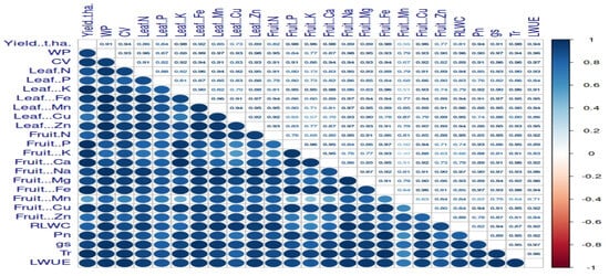 Yield (tons ha−1) showed strong positive correlations with WP (r = 0.94, p = 0.01), CV (r = 0.91, p = 0.01), leaf N (r = 0.85, p = 0.01), and Pn (r = 0.94, p = 0.01), indicating the impact of optimized fertigation on crop productivity (Figure 8). Leaf macronutrients, viz., P and K, correlated positively with fruit P (r = 0.89, p = 0.01) and K (r = 0.92, p = 0.01) concentrations, suggesting that both the nutrient sinks operated in tandem. Likewise, the RLWC was highly correlated with physiological traits like Tr (r = 0.87; p = 0.01), gs (r = 0.92; p = 0.01), and LWUE (r = 0.92; p = 0.01), showcasing the role of effective water management in the physiology of plant nutrition. Fruit micronutrients such as Fe, Mn, and Zn correlated significantly with leaf Fe (r = 0.93, p = 0.01), Mn (r = 0.96, p = 0.01), and Zn (r = 0.91, p = 0.01) content, emphasizing the importance of balanced nutrient application to ensure a balance in the nutrient supply between the leaf as the nutrient source and the fruit as the nutrient sink. These findings reinforce the efficiency of sensor-based fertigation in improving resource-use efficiency, fruit yield, and fruit quality. The other detailed correlation values provide useful insights for further enhancing the fertigation strategies.