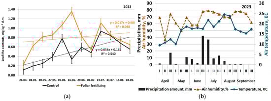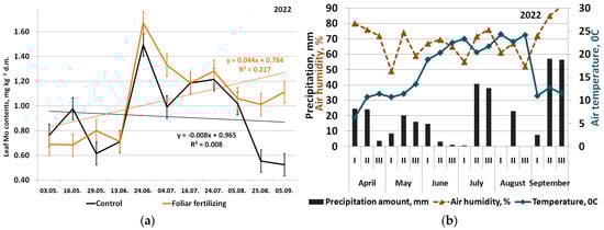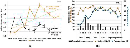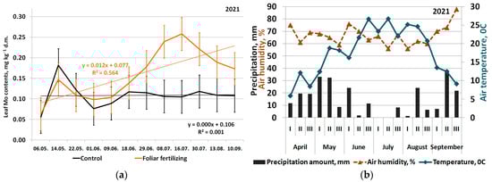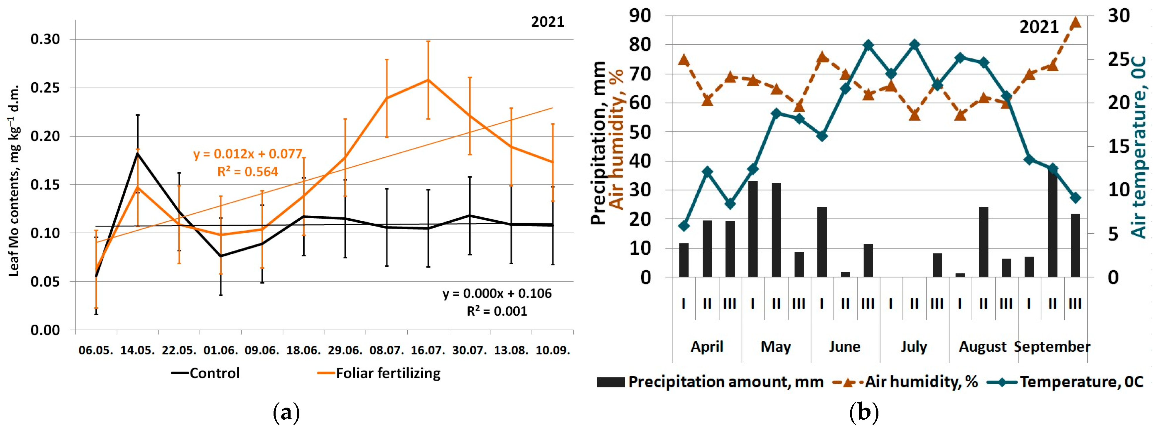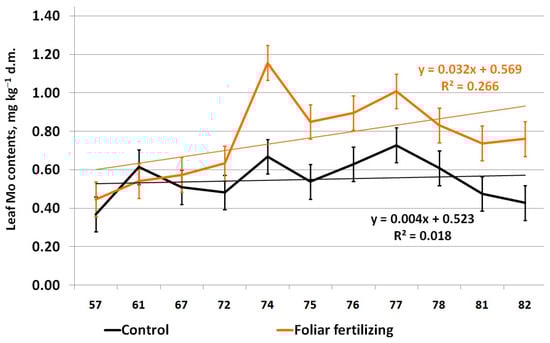Subsequently, the leaf Mo content in both variants decreased, but it remained very high in the treatment with foliar fertilizing (0.545 mg kg−1 in Control; 1.111 in Foliar fertilizing treatment). The leaf Mo content had a slight tendency to decrease in the control without treatments during the whole season, whereas under the influence of foliar fertilizing, there was a clear trend towards an increase in the nutrient content. Moreover, after the completion of the foliar fertilization, some increase in the nutrient content was also noted, even at a very high level of supply in early September. Higher nutrient content was also seen after foliar fertilizing in early September, even at a high level of Mo concentration.