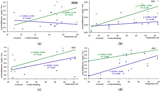 The relationships between foliar Mo and air temperature recorded in the different treatments in various years of the study ((a) 2020, (b) 2021, (c) 2022, (d) 2023).