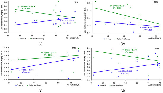 The relationships between foliar Mo and air humidity recorded in the different treatments in various years of the study ((a) 2020, (b) 2021, (c) 2022, (d) 2023).
