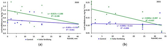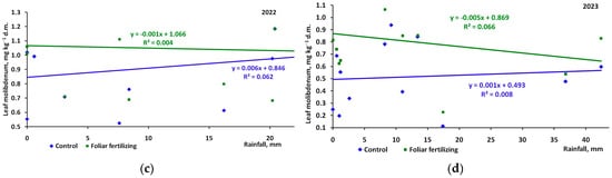 The foliar fertilizing application noticeably changed how ten days of precipitation affected leaf Mo levels. (Table 4, Figure 8). This relationship was quite noticeable only in 2020 and 2021. In 2022, despite an overall trend, leaf Mo levels in foliar-fertilized plants were unrelated to precipitation. There was a weak correlation between precipitation and leaf Mo status in 2023; however, it is noteworthy that with increasing precipitation, the leaf Mo contents decreased. Leaf Mo status exhibited a slight inverse relationship with precipitation in 2023; as precipitation rose, leaf Mo levels fell. No strong relationship between precipitation and leaf Mo content was observed in any of the study years in the control. At the same time, the nature of the weak relationships in separate years of the research was contradictory—both positive and negative. Available data show no clear link between precipitation and leaf Mo in the unfertilized control.