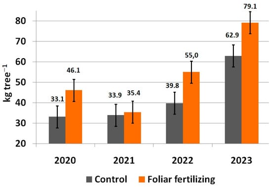 The yield of cultivar Bogatyr/B 118 apple trees under the influence of foliar fertilizing.