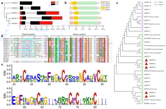 Sequence analysis results for MaPDFs and their encoded genes. (a): Gene structures of MaPDFs; (b,c): conserved motifs and phylogenetic analysis results for MaPDFs; (d): sequences alignment results for PDFs from banana and some other plant species; (e): Weblogo for the conserved sequences in MaPDFs. bp: base pair; UTR: untranslated region; CDS: coding sequence; N: N-terminal; C: C-terminal; aa: amino acid; At: Arabidopsis thaliana.