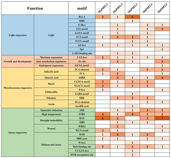 Promoter analysis showed significant differences in types and numbers of the cis-acting elements among MaPDFs promoters (Figure 2). In total, we identified ten kinds of light-responsive elements in MaPDFs promoters, with the promoters of MaPDF2.1~2.5 containing three, seven, six, six, and four types of light-responsive elements, respectively. All MaPDFs promoters contain the AE-box element. Three growth and development related elements, including meristem-metabolism-related CAT-box, zein metabolism regulatory O2-site element, and endosperm-expression-related GCN4_motif elements, were identified in MaPDFs promoters. Of them, the CAT-box element was present in all MaPDFs promoters.
