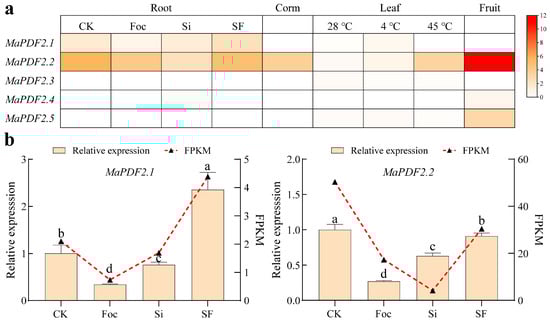 Based on transcriptome data, the relative expression levels of MaPDFs in roots (CK, Si, Foc and SF), leaves (28 °C, 4 °C and 45 °C), corm, and fruit were first compared (Figure 3a). MaPDF2.2 was expressed highly in all tested organs, and its expression levels in all these organs were all the highest among these five MaPDFs. Only MaPDF2.1 and MaPDF2.2 were expressed in all root samples, and MaPDF2.4 was expressed slightly in root from the Si group. MaPDF2.2 is the only member that is expressed in corm. All MaPDFs except MaPDF2.4 were expressed in leaves; three MaPDFs (MaPDF2.2, MaPDF2.4, and MaPDF2.5) were expressed in fruit.