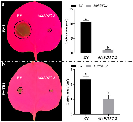 Of the five MaPDFs, MaPDF2.2 expressed the highest in all banana organs. Its expression could be significantly downregulated by FocTR4 and S. indica, but its expression in the SF group was significantly higher than that in the Foc and Si groups. Therefore, it is hypothesized that MaPDF2.2 contributes greatly to the S. indica-enhanced FW resistance. To verify this hypothesis, tobacco-leaf-based disease resistance assays were performed. Results showed that at three days after inoculation, the lesion areas caused by Foc1 and FocTR4 infection in tobacco leaves overexpressing MaPDF2.2 were significantly smaller than that overexpressing EV (Figure 4). In tobacco leaf overexpressing MaPDF2.2, the lesion area caused by Foc1 and FocTR4 was only 10.82% (Figure 4a) and 44.79% (Figure 4b) of its corresponding EV, respectively. These results indicated that the overexpression of MaPDF2.2 can significantly inhibit the infection and the growth of Foc1 and FocTR4 pathogens in tobacco leaves.