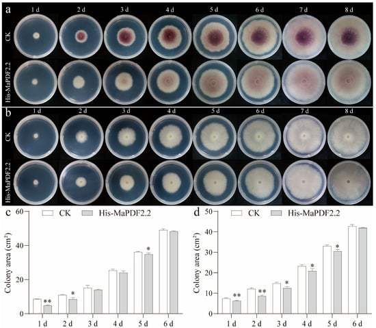 For FocTR4, a very significant difference was identified between the His-MaPDF2.2 added and non-added controls at 1 dpi and 2 dpi (p < 0.01), with the fungal area on His-MaPDF2.2 added PDA media accounting for 70.57% and 74.5% of CK, respectively (Figure 5d). At 3, 4 and 5 dpi, the average FocTR4 colony area on His-MaPDF2.2 added PDA media was significantly smaller than that on the normal PDA media (p < 0.05), accounting for 84.5%, 89.49%, and 92.27% of CK (Figure 5d), respectively.