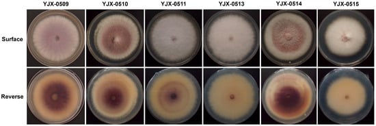 Six fungal isolates (YJX-0509, YJX-0510, YJX-0511, YJX-0513, YJX-0514, and YJX-0515) were isolated from the tulip bulbs showing rot symptoms. Their colonies on PDA showed cottony aerial mycelia with white filamentous margin on the surface; three isolates (YJX-0509, YJX-0510, and YJX-0514) produced violet pigments from the surface view (Figure 2). The reverse sides of about half of the colonies (YJX-0510, YJX-0511, and YJX-0514) on PDA showed annual-ring-like patterns (Figure 2). The pigment production and annual-ring-like pattern were variable for the subcultures of the same isolate under the same conditions.