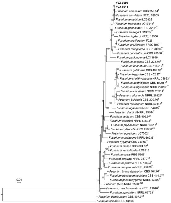 Phylogenetic maximum-likelihood tree of Fusarium fujikuroi species complex based on concatenated tef1, rpb1, and rpb2 sequences. The maximum-likelihood tree on 3704 sites was generated using IQ-TREE multicore version 1.6.12 with the TIM2e+I+G4 model. The support percentages of ultrafast bootstrap (1000 tests) are shown at the nodes. The scale bar indicates 0.01 substitutions per site. The GenBank accession numbers of the sequences from the isolates YJX-0509 and YJX-0511, the representative strains including type (T), epitype (ET), or neotype (NT) strains of the closely related species within the Fusarium fujikuroi species complex, and the outgroup F. solani strain NRRL 43468 are listed in Table S1.