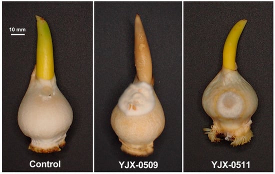 The pathogenicity of the F. annulatum isolates to tulip bulbs was verified with Koch’s postulates. To promote Fusarium pathogenicity, we inoculated fresh mycelia of isolates YJX-0509 and YJX-0511 onto wounded bulbs’ surfaces after removing the tunics and kept the bulbs under 25 °C, a general optimum temperature for mycelial growth of Fusarium, and high relative humidity (>75% under the plastic cover) in a gnotobiotic condition. The resulting white cottony colonies on the bulb surface and dry rot symptoms (Figure 5) are not the same as the original diseased tulips (Figure 1), probably because the wounding inoculation, temperature, relative humidity, the gnotobiotic condition, and incubation time were different from the original conditions with relatively low temperature and humidity and relatively complex microbiome.
