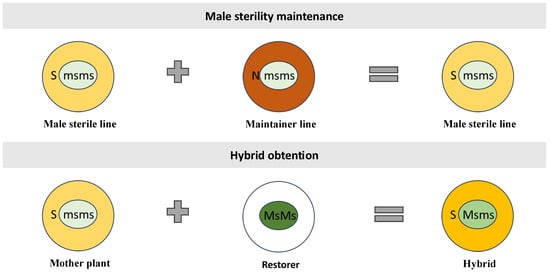 Maintaining male sterility through hybridization: The first lane depicts maintenance of male sterile line (S msms) by crossing with maintainer line (N msms). The second lane depicts hybrid breeding by crossing male sterile line as female parent with homozygous pollen parent.