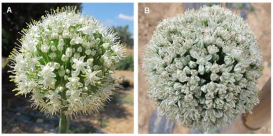 Onion inflorescence: (A) fertile and (B) sterile inflorescences exhibiting differences in their overall architecture (malformed or shriveled anthers, the arrangement of flowers, the presence or absence of certain structures). The overall appearance of the inflorescence can be indicative of fertility or sterility.