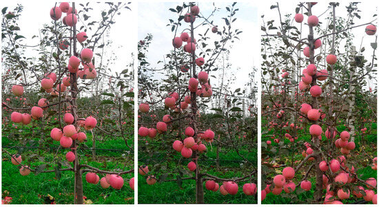 Statistical data show that as of 2018, the total area of apple orchards in China for dwarf-rootstock-intensive cultivation is about 500 thousand hectares, with Shaanxi Province being the main province promoting this cultivation model and making particularly outstanding contributions. Specifically, Baishui County in Weinan City, Shaanxi Province, serves as a model for dwarf apple cultivation nationwide and widely adopts the spindle-shaped cultivation mode. Compared with other cultivation modes such as the “V” shape, “Y” shape, and “wall” shape, the spindle-shaped mode is favored for its abundant fruiting branches and strong fruit-bearing capacity, becoming the mainstream choice in the construction of modern standard orchards in China. The spindle-shaped apple trees are shown in Figure 1.