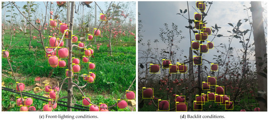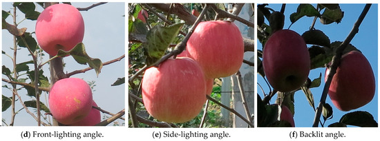 The spindle-shaped apple tree in the Qian County Agricultural Science and Technology Experimental Demonstration Base in Shaanxi Province and the Baishui Apple Experimental Station of Northwest A&F University was taken as the research object. We used the Canon PowerShot G16 camera (Canon, Tokyo, Japan) to capture images during different time periods (morning, noon, afternoon) on sunny and cloudy days. The shooting distance (distance between the camera and the apple tree) during image acquisition varied from 0.5 to 1.5 m, and images were captured from multiple angles, including with varying degrees of obstruction of fruits by leaves or branches, overlapping between fruits, and under different lighting conditions (forward, side, and backlight) (Figure 2). A total of 801 apple tree images were collected. The image resolution was 4000 pixels by 3000 pixels, and images were saved in JPEG format. The images were then processed on a Lenovo Legion Y7000P computer (Lenovo Group, Beijing, China) equipped with an Intel Core i7-9750H CPU (with a clock speed of 2.6 GHz, Intel Corporation, Santa Clara, CA, USA) and 16 GB of memory and combined with an NVIDIA RTX 2060 graphics processor (NVIDIA Corporation, Santa Clara, CA, USA) and the Windows 10 operating system.