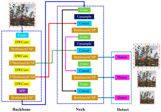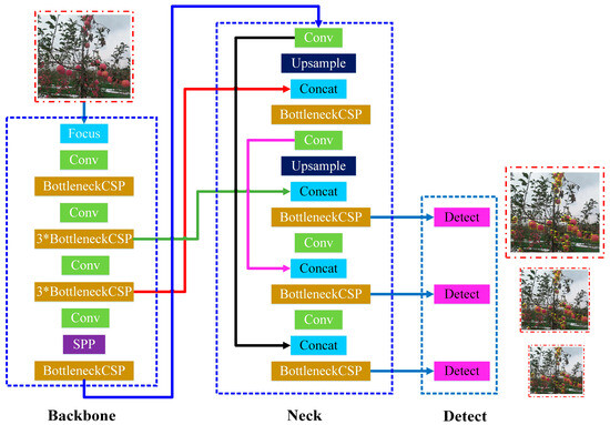 Due to the focus of this study being on the recognition task of specific target objects (i.e., fruits on apple trees) and the high requirements for the real-time response ability and lightweight level of the model recognition, based on a comprehensive consideration of the model’s recognition accuracy, processing efficiency, and model size, the YOLOv5s network (as shown in Figure 3) was chosen as the benchmark architecture, and targeted improvement design was carried out accordingly, with the aim of establishing an efficient and lightweight apple target recognition network.