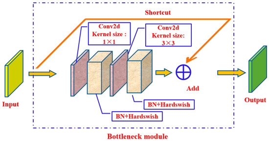 The YOLOv5s architecture consists of three core network structures: the Backbone, Neck, and Detect networks. Among them, the Backbone network plays the role of a feature extractor, utilizing the powerful feature-extraction capability of convolutional neural networks (CNNs) to extract and generate rich image-feature representations from multiple fine-grained levels of the input image. Specifically, the third level of the Backbone network adopts the BottleneckCSP module, which is designed to further enhance the network’s ability to capture and learn deep and complex features of images. The core structure of the BottleneckCSP module is the Bottleneck module, which is a lightweight convolutional neural network structure. The module also includes a residual connection structure (shortcut), which is used to directly add input features to output features to alleviate the gradient-vanishing problem and to accelerate the training convergence. The schematic diagram of the Bottleneck module structure is shown in Figure 4.