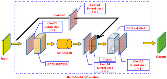 The BottleneckCSP module is an improvement and extension of the Bottleneck module, which extends its functionality by introducing a CSP structure to optimize the network performance and efficiency. Compared with traditional Bottleneck modules, BottleneckCSP modules can improve the learning ability and generalization performance of the model while reducing computational and parameter complexity. The schematic diagram of the BottleneckCSP module structure is shown in Figure 5.