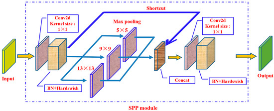 In addition, the Spatial Pyramid Pooling (SPP) module has been introduced at the ninth level, which can map feature maps of any size to fixed dimensional feature vectors, effectively expanding the global view of the network and enhancing the model’s ability to integrate global information from images. The schematic diagram of the SPP module structure is shown below (Figure 6):