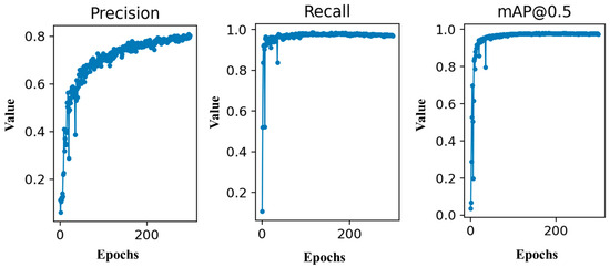 The changes in Precision, Recall, and mAP scores of the model during the network training process are shown in Figure 9. It can be observed that the Precision of the model continuously improved throughout the entire 300 rounds of training, indicating that the recognition accuracy of the model for apple targets gradually increased. Recall showed a fast upward speed in the early stages of training and had reached a high level by the time it completed 300 rounds of training. As Precision and Recall increased, the mAP score eventually reached a stable state of over 90%.