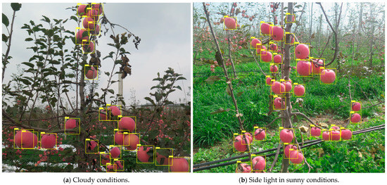 In this article, we provide an example of apple target-detection results using the improved model design under different weather and lighting conditions, as shown in Figure 10. Among them, the identified fruit targets are marked with yellow boxes. Based on Figure 10, it can be determined that the recognition model established in this study exhibits high environmental adaptability and robustness. Its effective recognition ability for apple targets is not limited to uniformly illuminated apple tree images collected under cloudy conditions, as it can also effectively detect fruit targets under strong lighting conditions in sunny environments. On the other hand, the model can accurately recognize fruit targets on apple trees when dealing with images under various complex lighting conditions, such as forward, side, and reverse lighting.